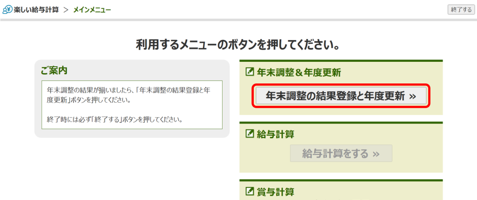 ①12月給与を確定後、楽しい給与計算>メインメニューの画面に以下のボタンが表示されますので、年末調整の結果登録を行ってください。