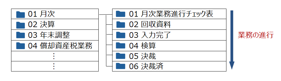 フォルダ名が進捗管理表のように、業務の進行状況になっているのが特徴です。