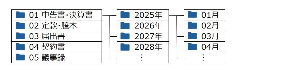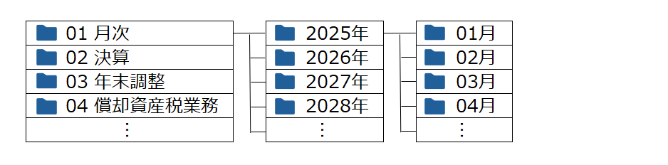 この事例では、顧客とのデータ共有はしていないので、会計事務所目線で使いやすいよう、「業務別」でのフォルダ分けとなっております。