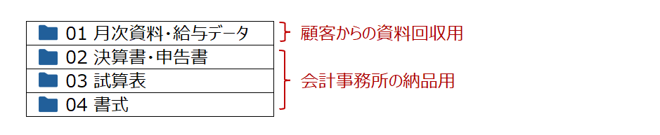 顧客からの資料回収と会計事務所からの納品の両方を実施している事例です。この事例では、顧客が使いやすいよう、一番上に「資料回収用」のフォルダを設置しています。