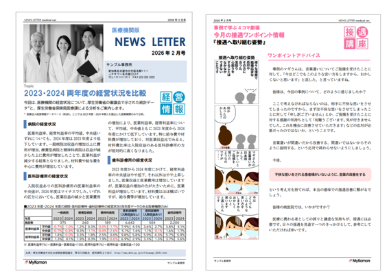 医療機関向けの経営情報、労務情報、接遇情報を4ページにまとめ、毎月公開しています。
