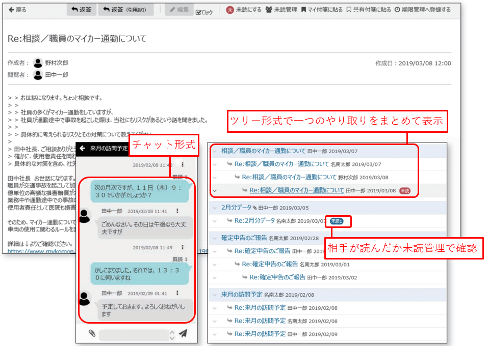 顧問先とのやり取りがMyKomon上に蓄積されるので、担当変更しても過去のやり取りが共有できます。