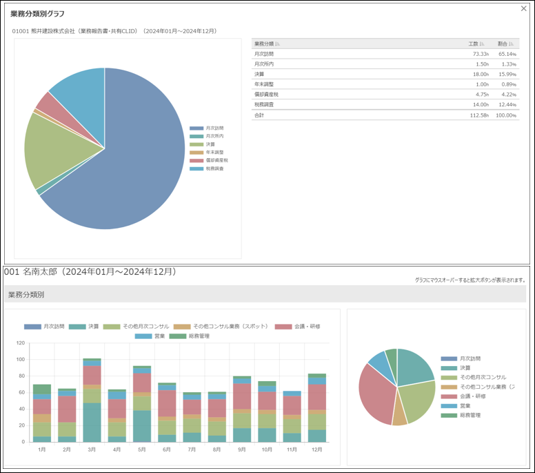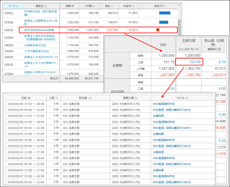 顧客ごとに詳細を確認することで、業務分類別や担当者別に生産性を分析し、問題点を発見することが可能です。