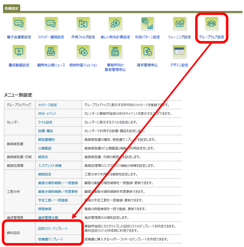 ③資料回収の「回収リストテンプレート」「依頼書テンプレート」をクリック
