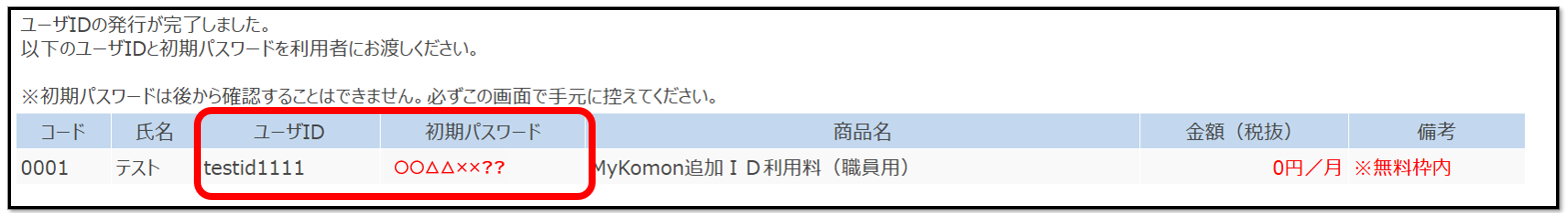 ⑦IDの発行が完了すると、IDと初期パスワードが表示されます。