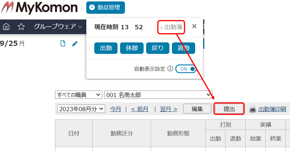 ※翌月以降の出勤簿の提出はできません。当月に限り、締日前でも出勤簿を提出・承認できます。