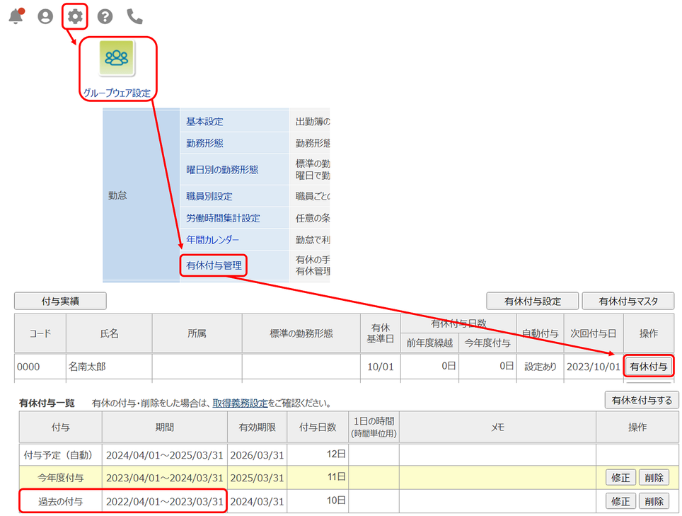 ③該当職員の「有休付与」をクリック
