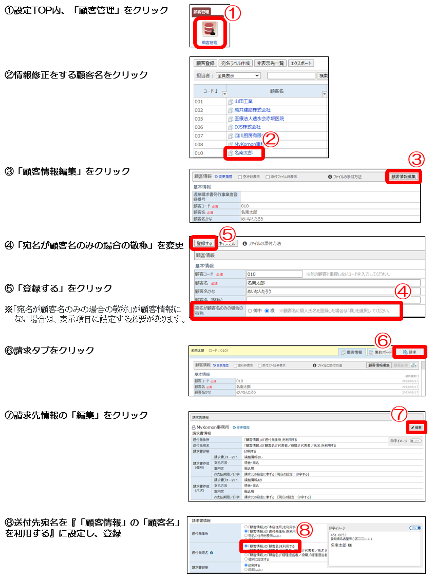 1)「宛名が顧客名のみの場合の敬称」を設定する方法