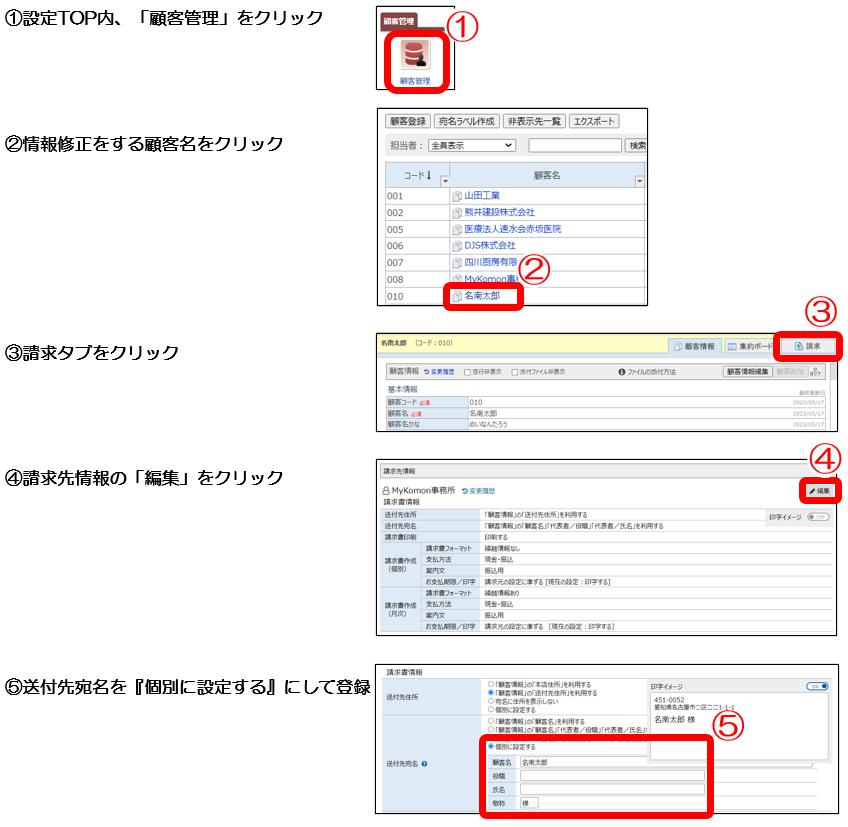 ※顧客管理の顧客名を変更したら自動的に請求書の宛名も変更がされることをご希望の場合は、1がおすすめです。