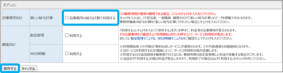 ➂「自事務所の給与計算で利用する」をチェックし、「保存する」をクリック