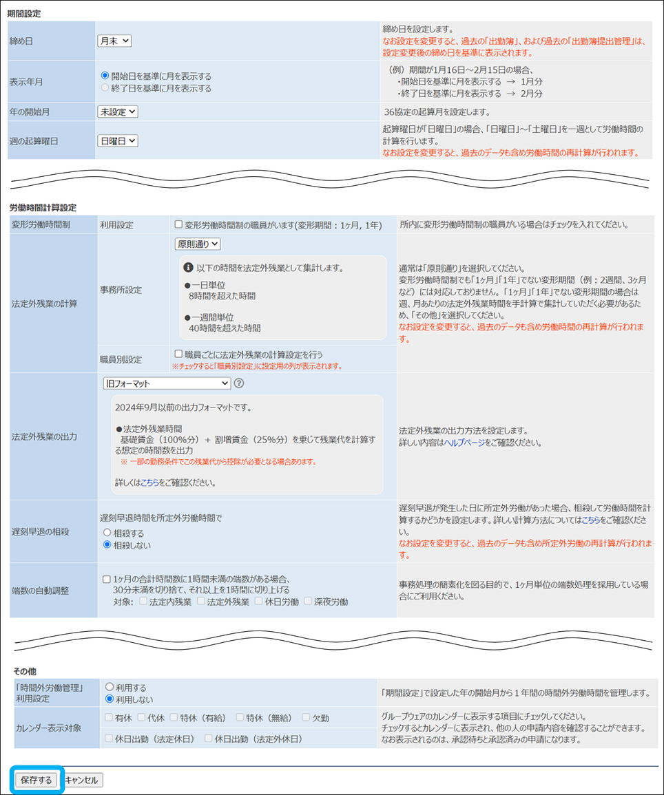 ※「法定外残業の計算」で変形労働時間制を利用する場合、変形期間は1か月、1年のみ対応しています。