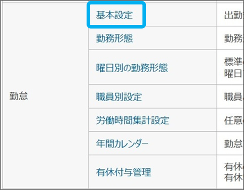 基本設定では、出勤簿の締め日や勤務区分の選択肢などを設定します。