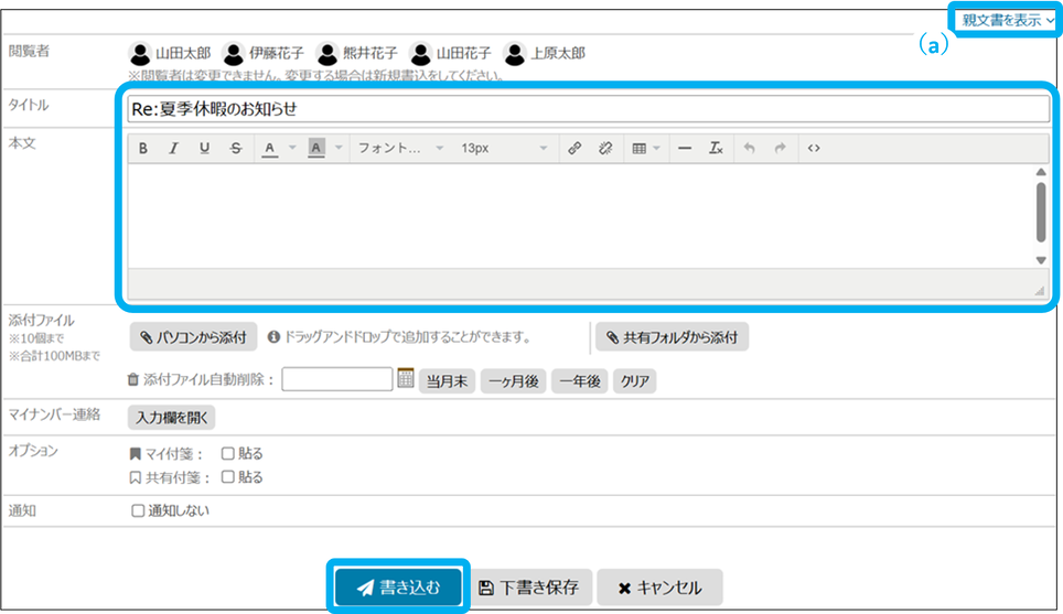 ⑤タイトル、本文を入力し、「書き込む」をクリック