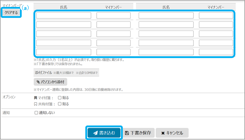 ⑤氏名とマイナンバーを入力し、「書き込む」をクリック