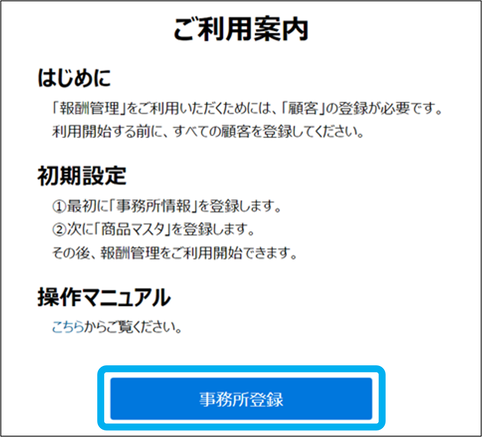 ②ご利用案内を一読のうえ、「事務所登録」をクリック