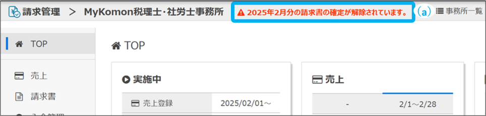 請求書の確定を解除した場合、ヘッダー部分にメッセージが表示されます。
