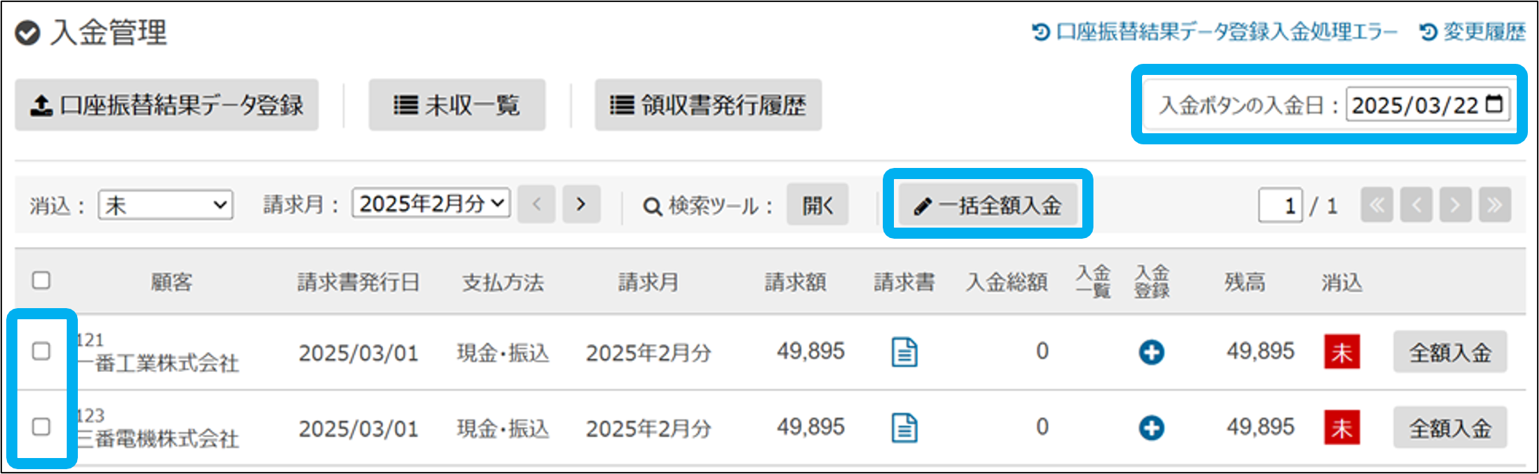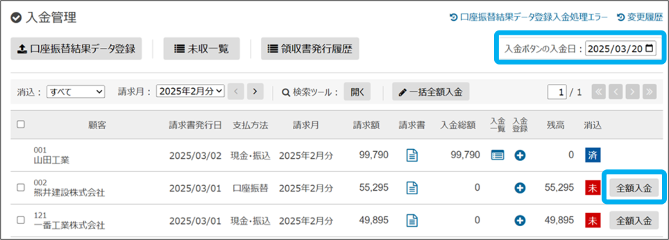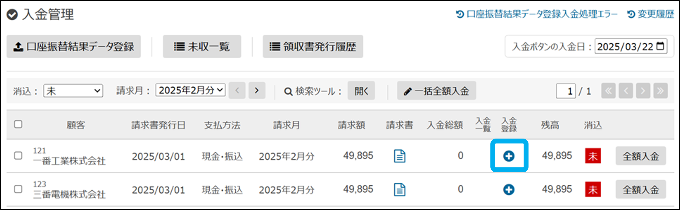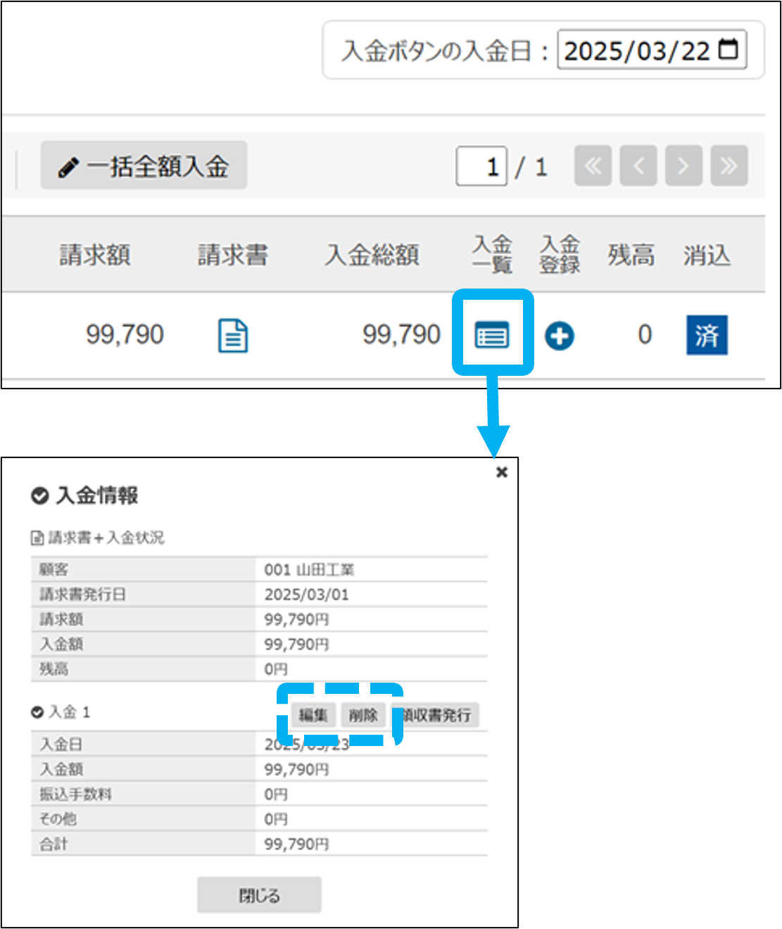 アイコンをクリックすると、入金情報を編集・削除できます。
