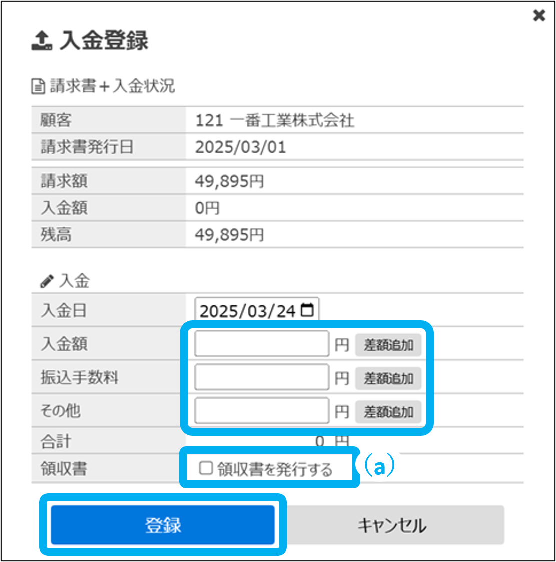 領収額内訳には、入金処理で登録した金額が反映されます。