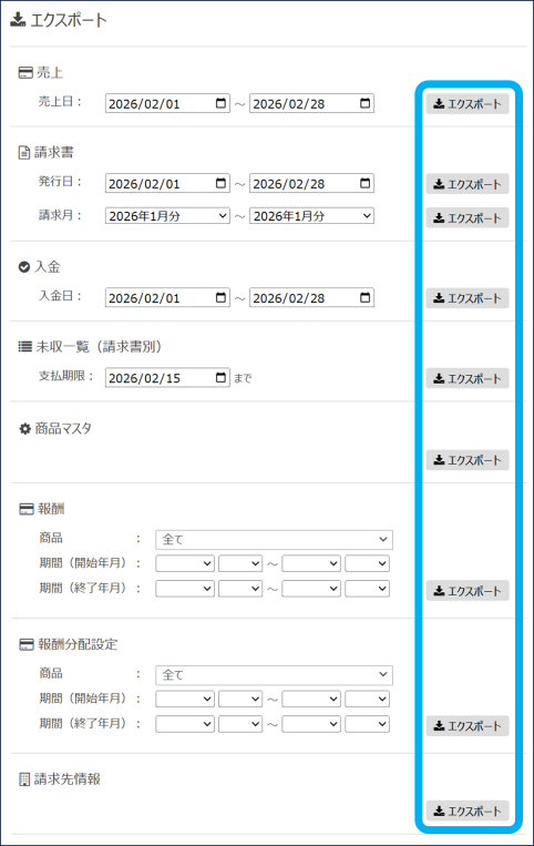 請求管理に登録している各種データをエクスポートできます。