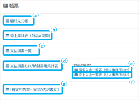 顧問先元帳や売上集計表、支払調書用の集計表など各種帳票を閲覧できます。
