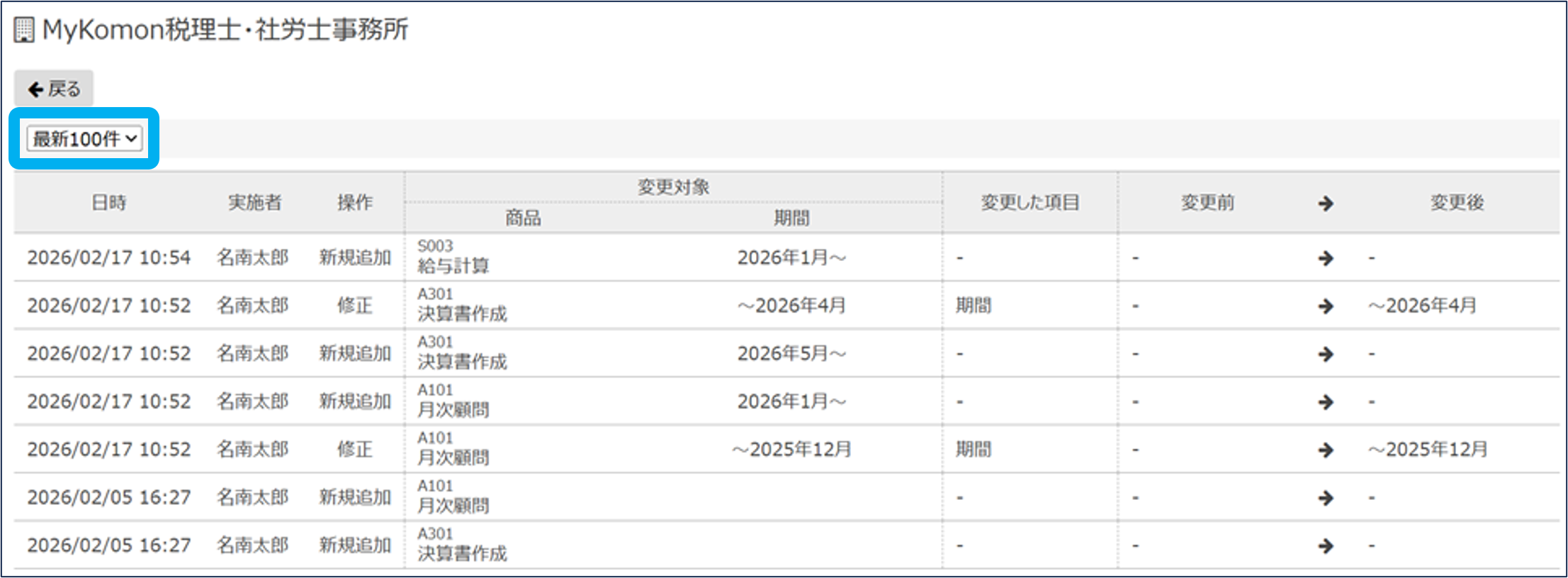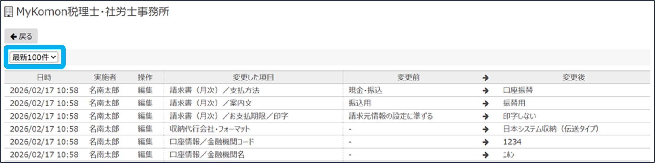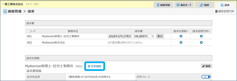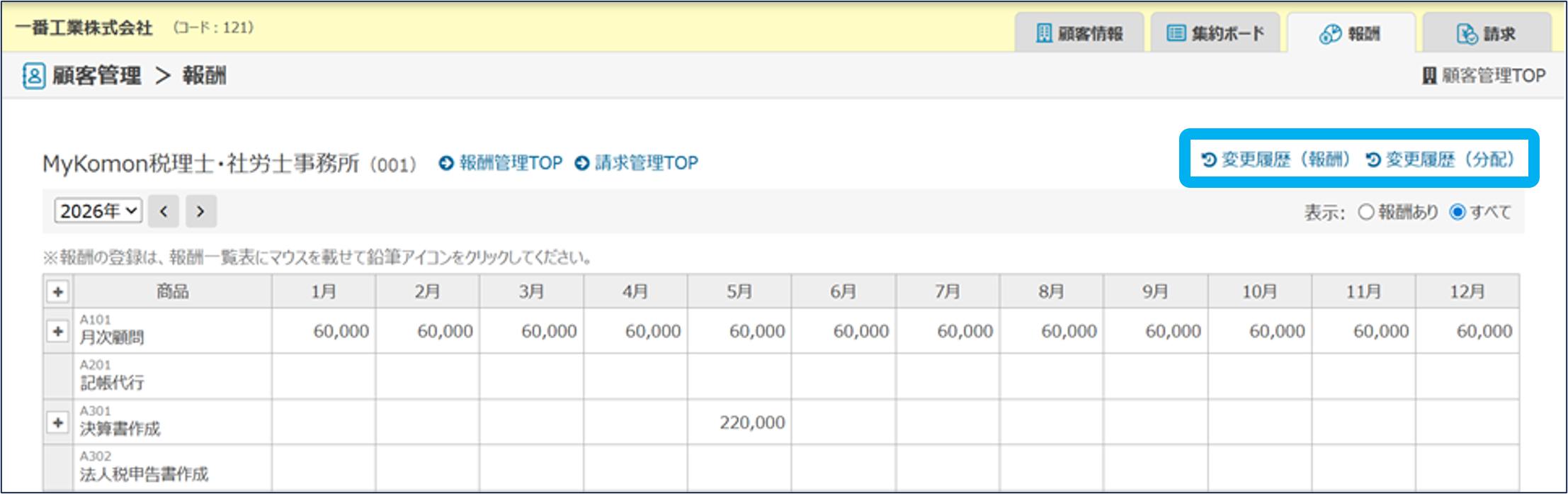 報酬と請求先情報の変更履歴を確認できます。