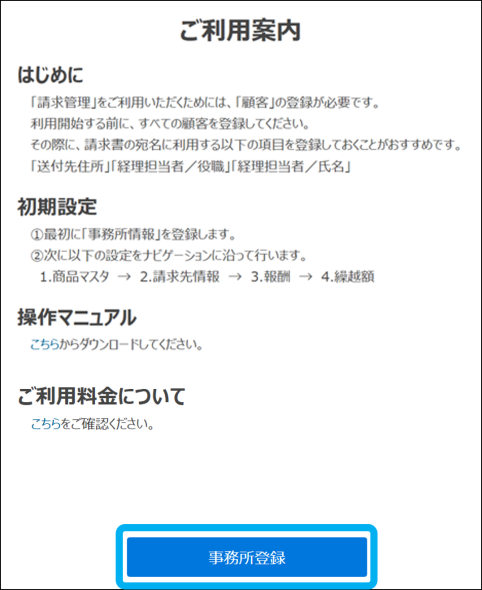 ②ご利用案内を一読のうえ、「事務所登録」をクリック