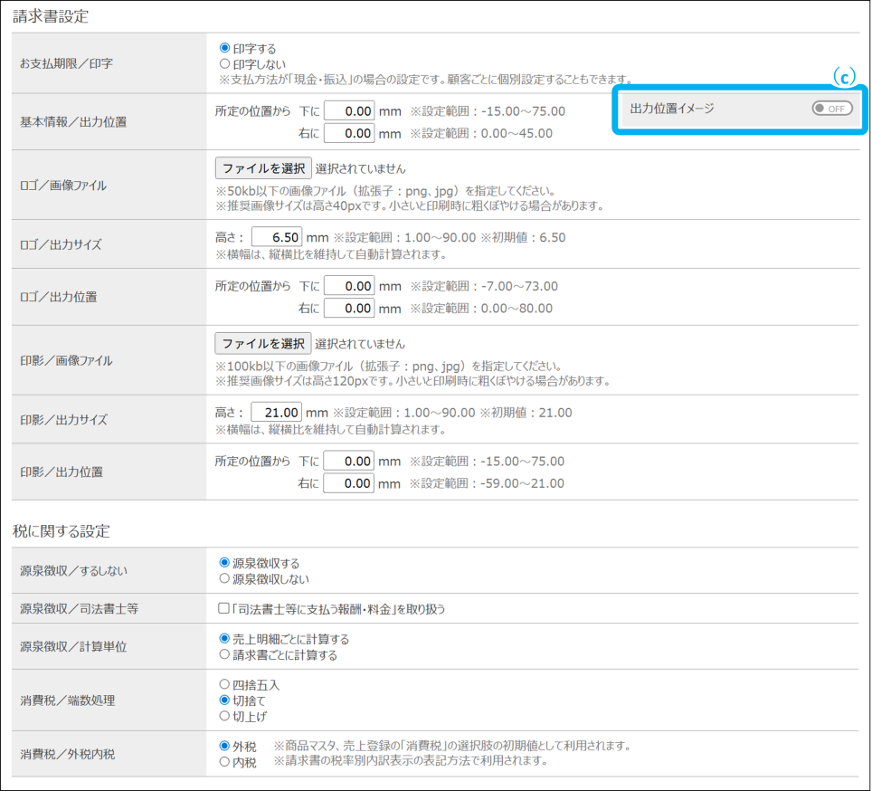 請求書作成時の出力位置のイメージを表示できます。