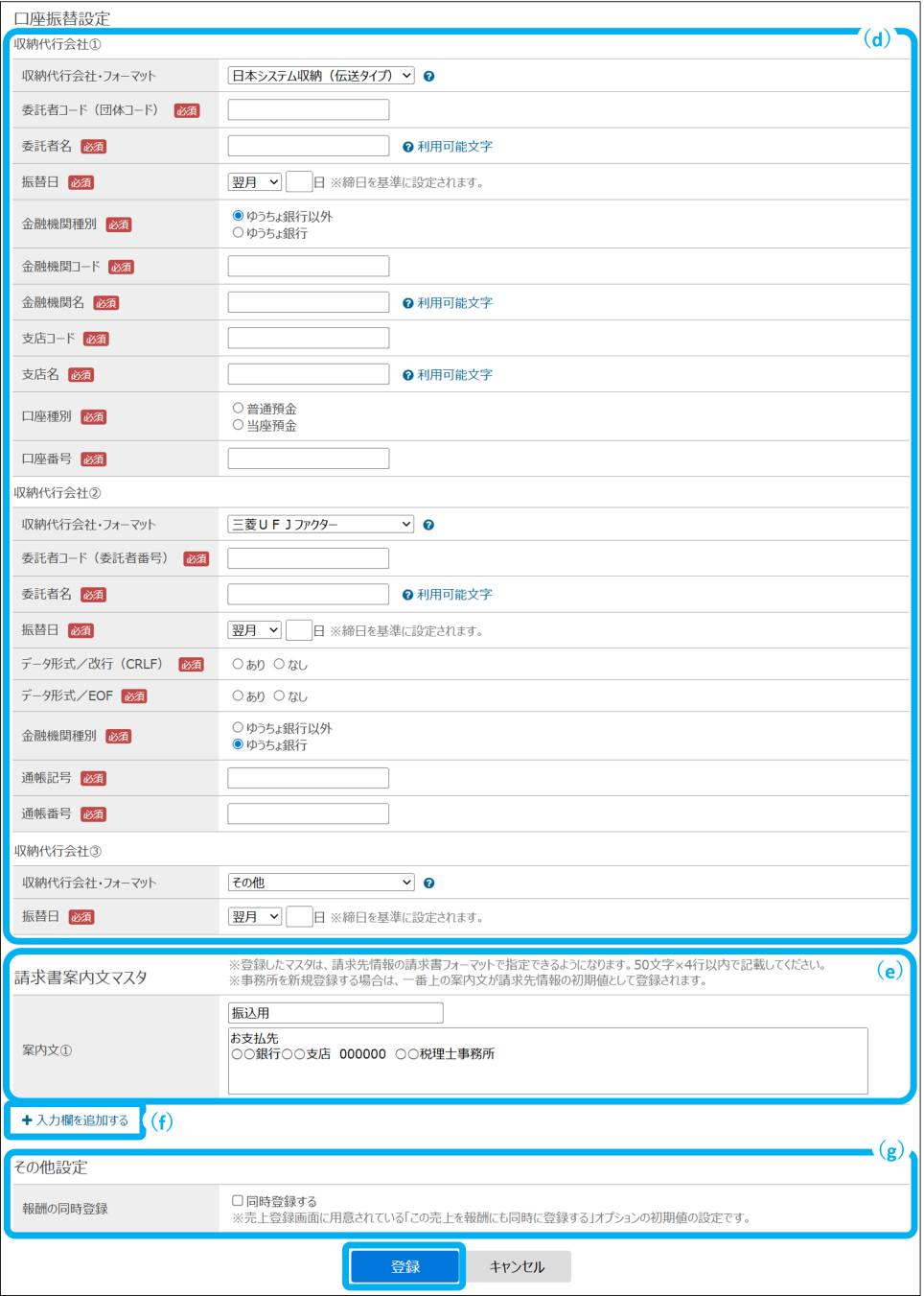 ⑤口座振替設定、請求書案内文マスタ、その他の設定を登録し、「登録」をクリック