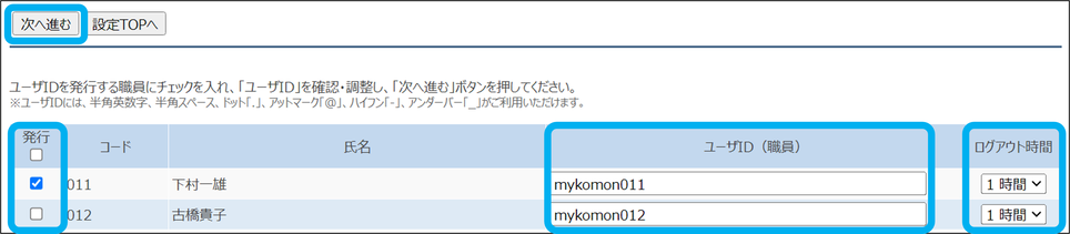 ②IDを発行する職員にチェックを入れ、「ユーザID」を 入力