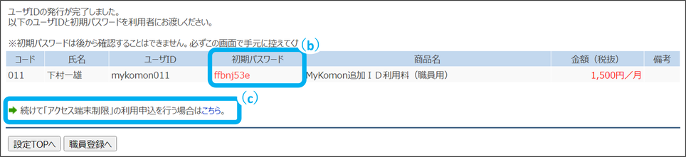 ※画面を遷移すると再確認できませんので、ここで必ず初期パスワードを控えてください。