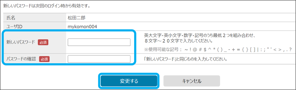 ※次回ログインより、新しいパスワードが有効になります。なお、有効になるまで1分程度かかります。