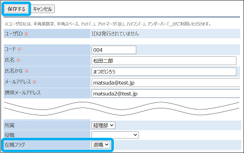 ②在職フラグを「退職」に変更し、「保存する」をクリック