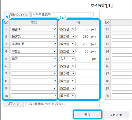 ③顧客管理トップの一覧に表示する項目を設定し、「保存」をクリック