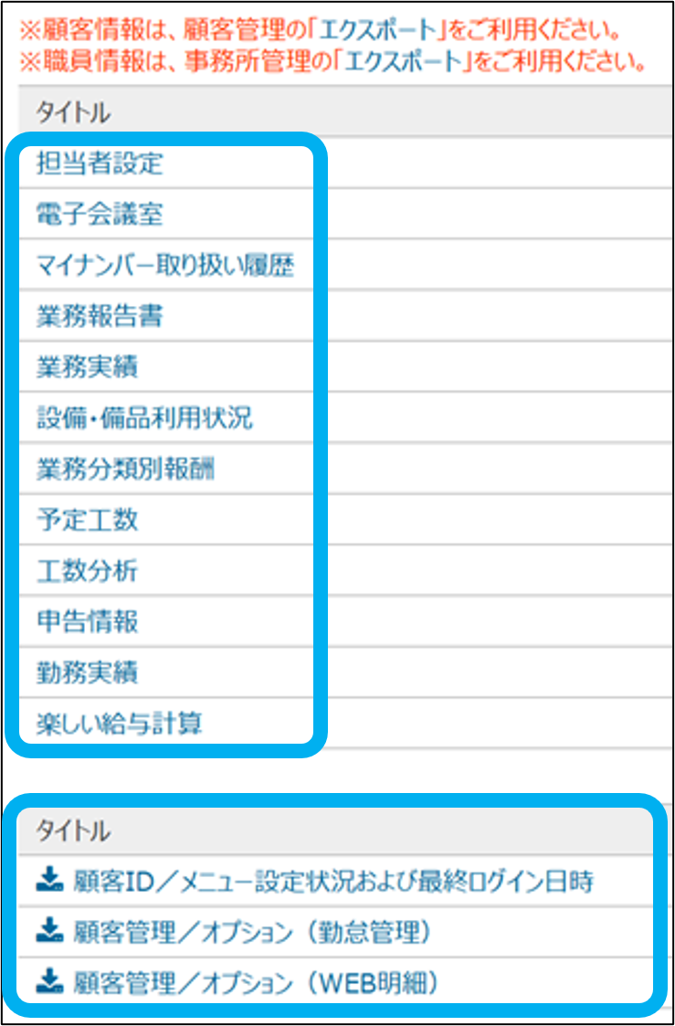登録した各種情報を、Excel形式またはCSV形式でエクスポートできます。