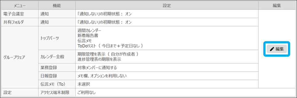 グループウェアのトップパーツ等の設定を確認、変更できます。