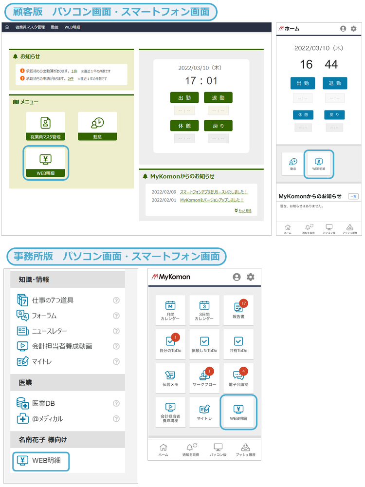 顧客の従業員または事務所の職員にIDを付与し、MyKomon上で”いつでもどこからでも”給与明細が閲覧できます。また給与明細をペーパレス化するだけではなく、誤配布のリスクも抑えることができます。
