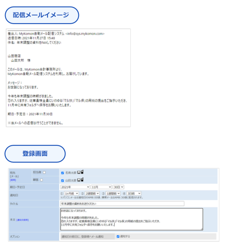 期限管理の紹介 顧客ごとに期限と予定を登録しておけば、指定した日にメールが届く機能です。 HOME メニュー紹介 業務メニュー 期限管理 ポイント 主な機能の紹介 成功事例の紹介 よくあるご質問 紹介サイト マニュアル 期限管理のポイント 連絡漏れの心配いらず 主な機能の紹介 ※画像は参考です。 連絡漏れの心配いらず あらかじめ文書と通知日を登録しておくと、自動的に携帯メール・パソコンのメールにメッセージを配信することができます。 毎年・毎月・隔月等で登録ができるので、賃金台帳や産休・育休関連の手続き書類の申請準備の依頼など、目的に合わせて設定することができます。 一度登録することで連絡漏れがなくなり、業務の段取りも飛躍的に向上します。 成功事例の紹介 CASE. いつも最適な時期にお知らせがあるねと喜ばれています 担当者によって連絡時期がばらつきがある うちの事務所は、顧客への連絡事項は担当者に任せているんですが、担当者によって連絡する時期にバラつきがあるんです。先日、ある会社の総務担当者から「連絡がギリギリで困りました。育児休業者への連絡になるので、もう少し余裕をもって連絡が欲しかったです。」と言われてしまいました。こういった連絡を、なんとかシステム化したいのですが・・・。 事前登録で、スムーズに余裕をもって連絡できるようになった あらかじめ通知したい日を設定しておくと、自動的に顧客へお知らせのメールが届きます。また、同じ内容を担当者にお知らせすることも可能です。 顧客からも「いつも前もって連絡が来るので本当に助かります」ととても喜んでいただいています。 期限管理のよくあるご質問 Q. 登録済みの期限管理を、一括で削除する方法はありますか? Q. 電子会議室に新規書き込みする際の、「書込み後、期限管理登録へ」とはなんですか ? もっとみる 期限管理についてもっと詳しく知りたい方はこちら 期限管理紹介サイト 期限管理のマニュアル ダウンロードする 期限管理を使用されている方へおすすめのメニュー 進捗管理表 顧客管理 楽しい給与計算 電子会議室 お問い合わせはこちら 移転、事務所名変更などの情報変更もこちらからご依頼ください。 ご意見・ご要望 情報変更依頼フォーム