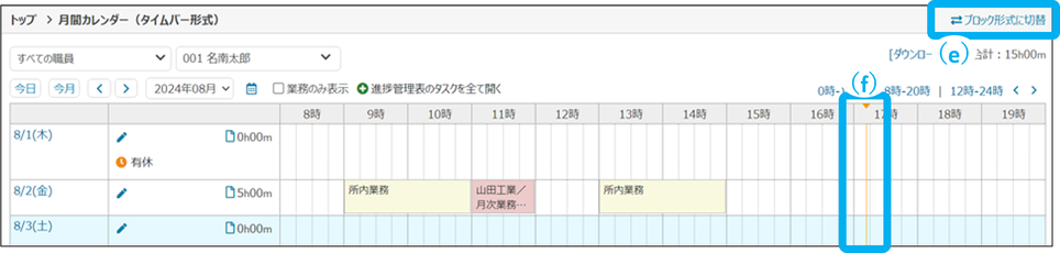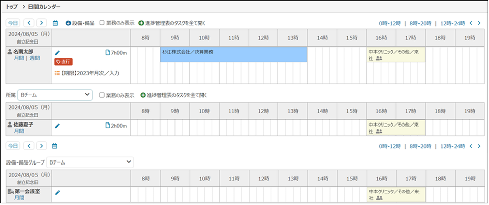 自分、他の職員、設備・備品の、その日の予定を確認できます。