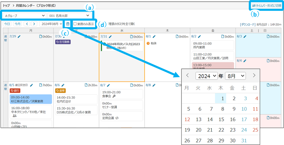 自分、他の職員、設備・備品の、1週間の予定を確認できます。