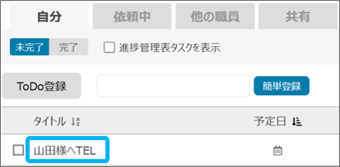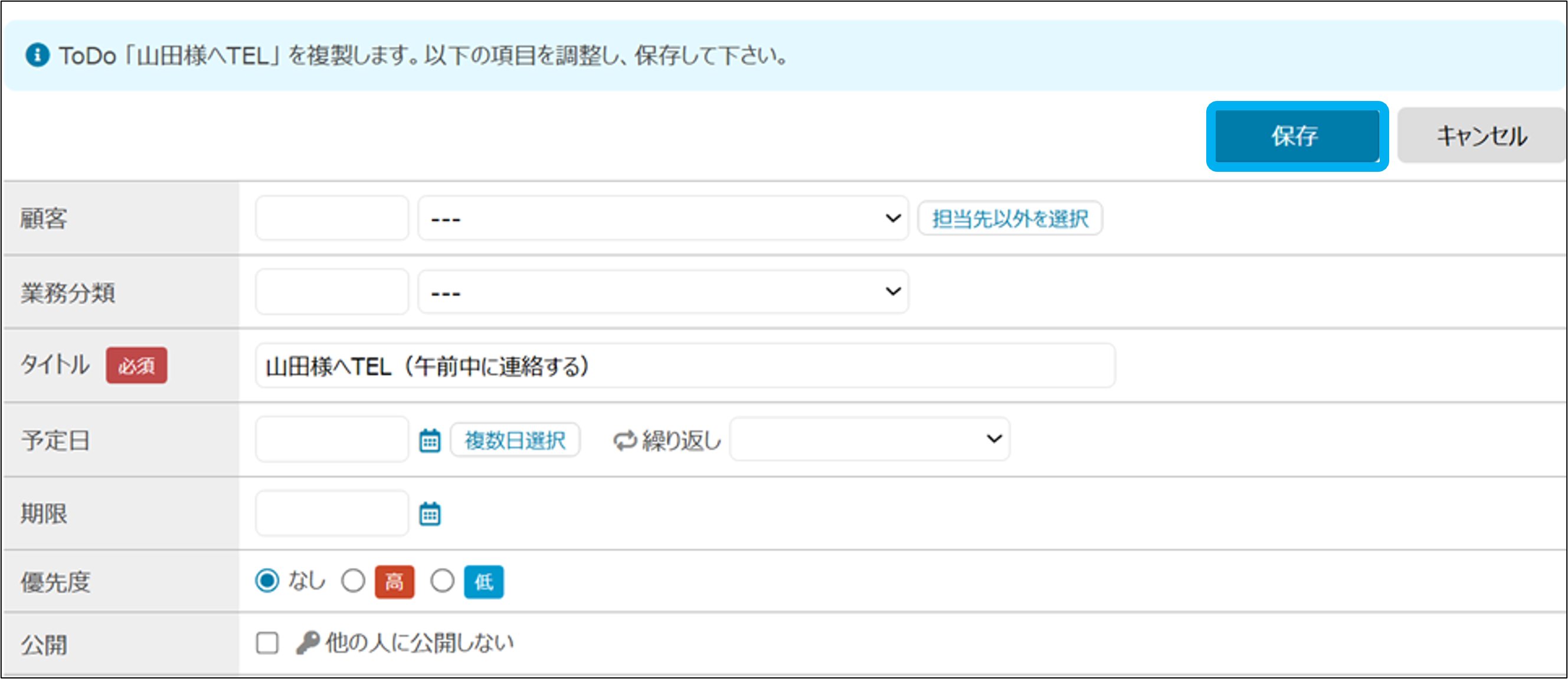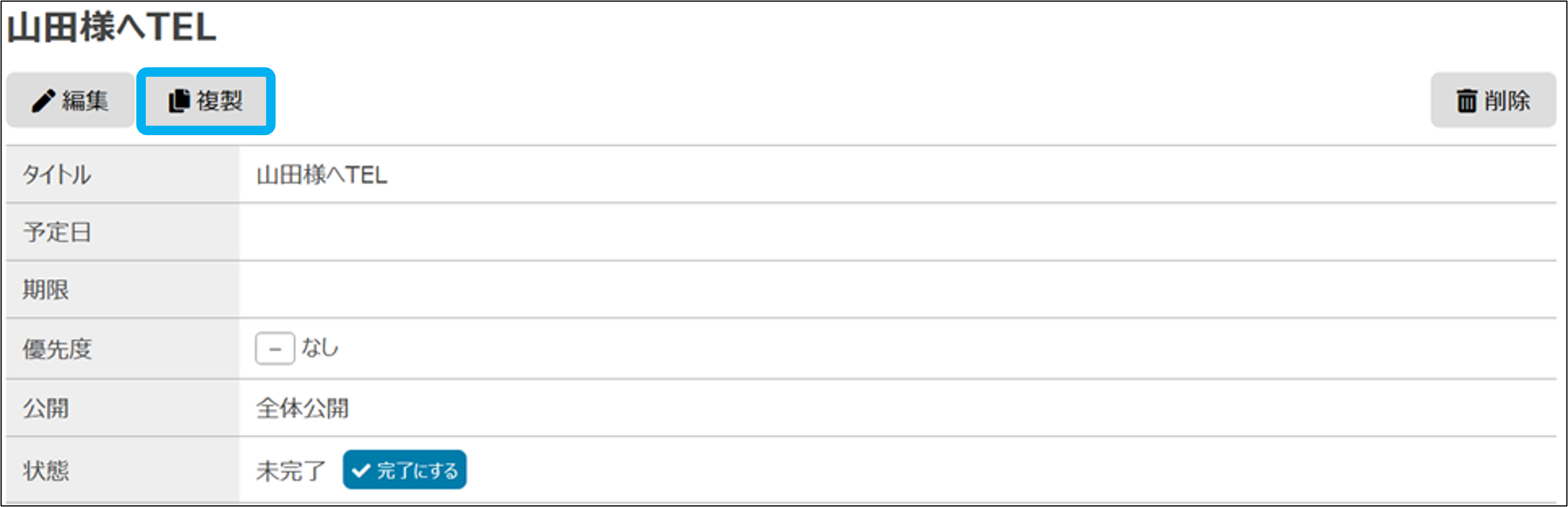グループウェアの関連マニュアル 利用準備編 活用編 HOME マニュアル グループウェアメニュー グループウェア 活用編 ToDoの複製 目次 活用編 TOP グループウェアマニュアル 活用編 カレンダー カレンダー /画面紹介 業務の登録 業務の修正・複製・削除 業務の移動(ドラッグ&ドロップ) グルーピング業務の修正・解除 ラベルの追加・削除 空き時間検索 ToDoリスト ToDoリスト/画面紹介 ToDoの登録 実施担当者の変更 ToDoの完了 ToDoの複製 ToDoの移動(ドラッグ&ドロップ) 共有ToDoリストの登録・編集・削除 共有ToDoの登録 共有ToDoリストの複製 閲覧・編集・削除の権限一覧 報告書 報告書一覧/画面紹介 業務報告書の登録・修正・削除 日報の提出・修正・削除 日報の承認 日報提出一覧表 業務報告書・日報の確認 業務処理簿 業務処理簿の作成・編集・削除 業務処理簿の印刷・ダウンロード 工数分析 工数分析/画面紹介 生産性分析 損益分析 予実分析 工数グラフ 進捗管理表 進捗管理表/画面紹介 ツールバー・その他の機能 進捗管理表の作成 進捗管理表の作成(中間申告・予定納税) タスクの完了 管理表の終了とロック・削除 管理表の複製 管理表の表示順変更 管理表の分類 集計情報 対象別表示 顧客情報の編集 資料回収 資料回収/画面紹介 資料回収業務の作成 回収リストの作成・公開 資料回収依頼書の作成 回収状況の完了処理 年度更新(資料回収業務) 資料回収業務の終了・削除 表示順の変更(資料回収業務) ワークフロー ワークフロー/画面紹介 申請書の作成 申請書の承認・決裁・処理 申請書の取り下げ 申請書の削除 申請書の複製 伝言メモ 伝言メモ/画面紹介 伝言メモの作成 伝言メモの確認・返答・削除 個人ツール マイグループ設定 立替精算書 その他 ホーム設定 ToDoの複製 ToDoを複製できます。 ①「ToDo」をクリック ②タイトルをクリック ③「複製」をクリック ④必要な項目を変更し、「保存」をクリック ToDoの複製が完了しました。 このページを印刷する