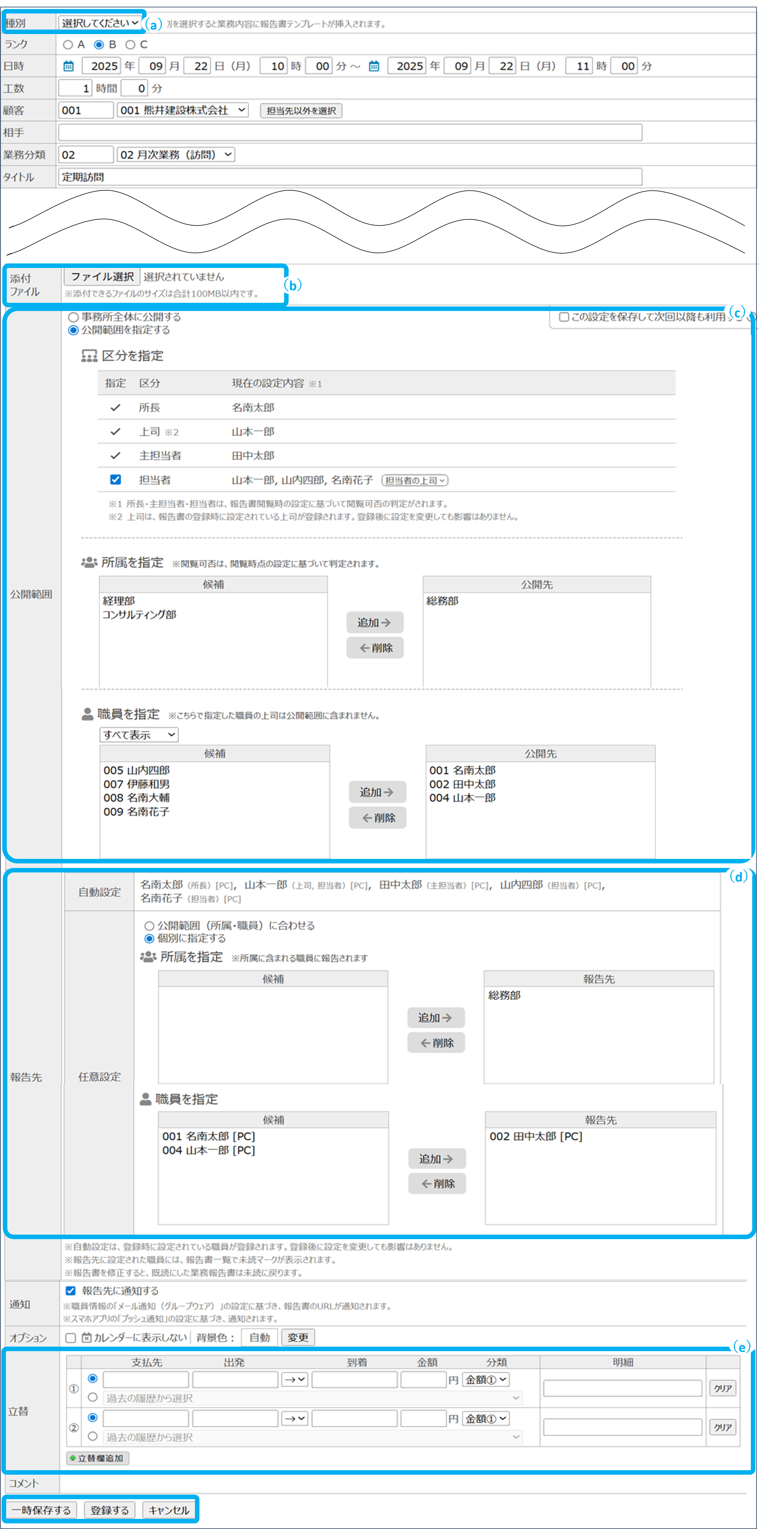 所長・上司・担当者のほか、報告する所属・職員を任意で追加できます。