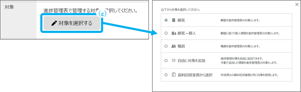 対象を「顧客」「顧客-個人」 「資料回収業務から選択」を選択した時に設定できます。