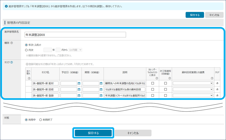 資料回収業務を選択できます。選択すると、進捗管理表に資料の回収状況が表示されます。