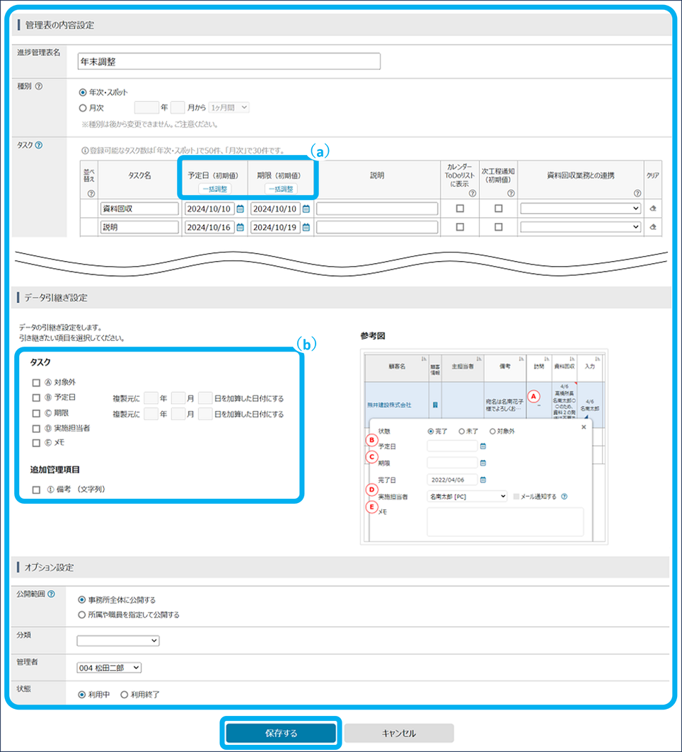 複製元の管理表から、タスク・追加管理項目のデータを引き継ぐことができます。