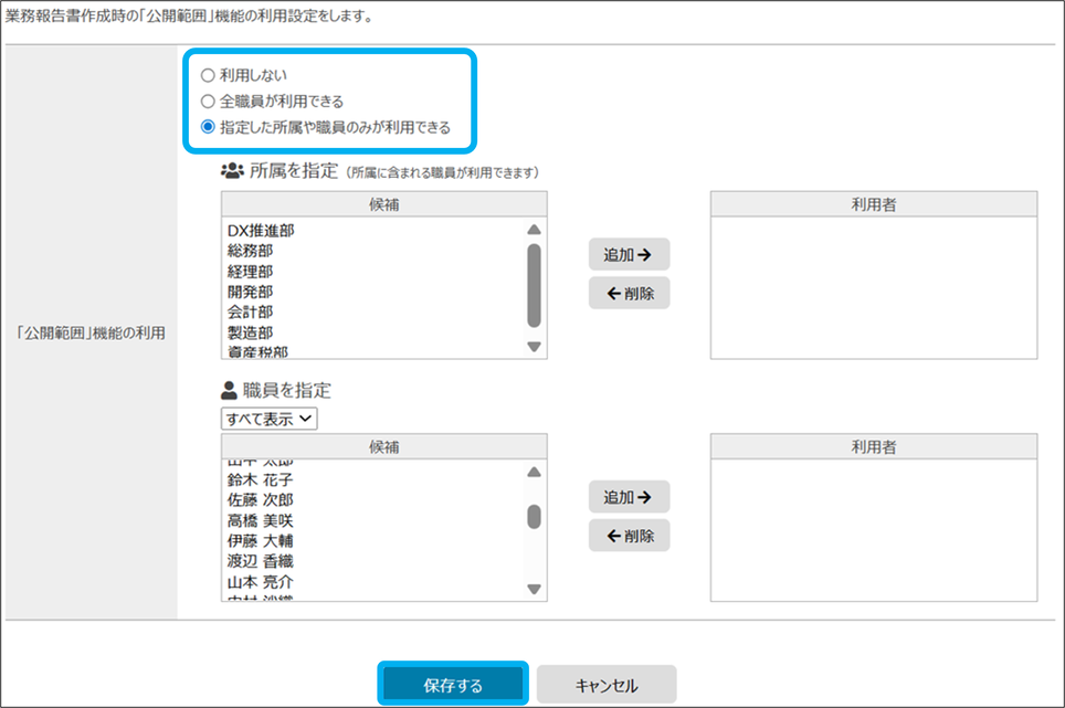 グループウェアの関連マニュアル 利用準備編 活用編 HOME マニュアル グループウェアメニュー グループウェア 利用準備編 公開範囲 目次 利用準備編 TOP グループウェアマニュアル 利用準備編 基本 権限設定 共通マスタ設定 業務分類(登録・修正・削除) 業務分類(一括編集) 立替 通知 グループウェアトップ メッセージ設定 カレンダー 休日・イベント ラベル設定 設備・備品グループ(登録・修正・削除) 設備・備品(登録・修正・削除) 業務報告書 報告書種別 公開範囲 業務報告書・日報 報告先 業務処理簿 業務処理簿/入力アシスト候補 工数分析 報酬設定 業務分類別報酬/一括登録 業務分類別報酬/年度更新 予定工数/一括登録 時間単価 進捗管理表 進捗管理分類 資料回収 回収リストテンプレート 依頼書テンプレート ワークフロー 申請フォーム(新規登録) 申請フォーム(修正・削除) 申請フォーム(表示順の変更) 公開範囲 「公開範囲」機能を利用できる所属や職員を設定できます。 ①「公開範囲」をクリック ➁利用する「公開範囲」を選択し、「保存する」をクリック 公開範囲の設定が完了しました。 このページを印刷する