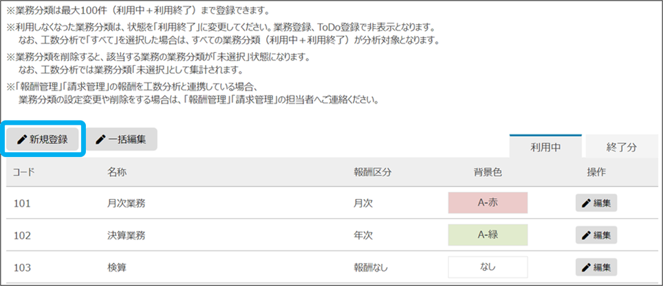 過去に利用していて、今後利用しなくなる業務分類は、削除せずに状態を「利用終了」に変更することをおすすめします。