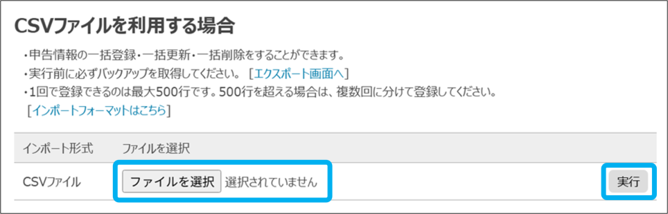 ・一度に登録、更新、削除できるのは最大500行です。500行を超える場合はファイルを分けて作成してください。