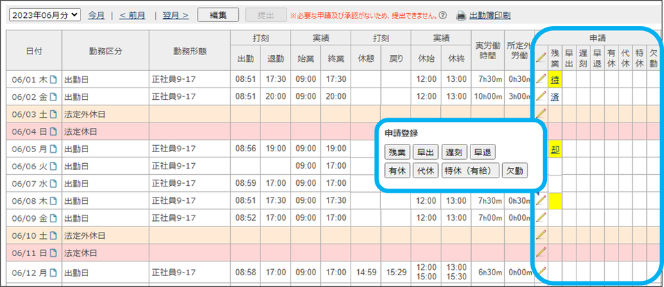 残業や有給休暇等の、申請・承認・却下ができます。