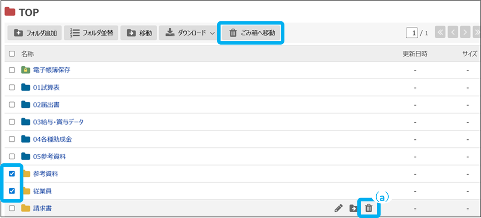 ③フォルダにチェックを入れ、「ごみ箱へ移動」をクリック