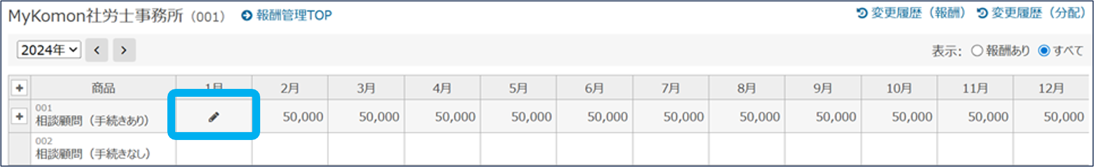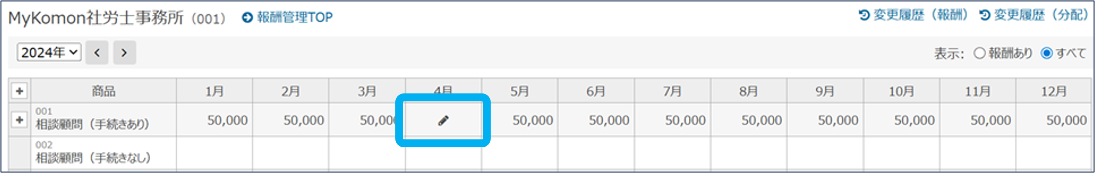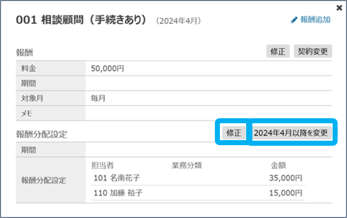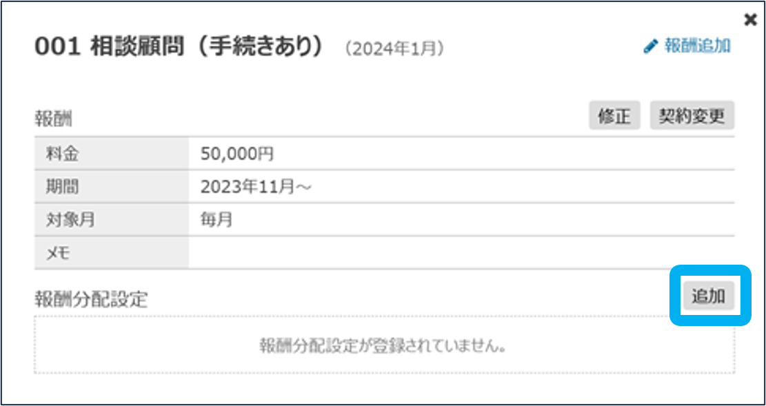 報酬管理の関連マニュアル 利用準備編 活用編 HOME マニュアル 所内メニュー 報酬管理 活用編 報酬分配設定 目次 活用編 TOP 報酬管理マニュアル 活用編 画面紹介 TOP 帳票 事務所情報 事務所の編集・切替・新規登録 報酬 報酬(修正・契約変更) 報酬(一括更新) 報酬分配設定 報酬分配設定(一括登録) その他 エクスポート(報酬管理) 一般職員向け画面 報酬分配設定 報酬分配設定を、途中変更・修正・追加できます。 ①「報酬管理」をクリック ②顧客内の「顧客一覧(顧客管理)」をクリック ③「報酬」をクリック 追加はこちら 追加はこちら 途中変更・修正 ④アイコンをクリック ⑤分配設定を途中で変更する場合は「20XX年○月以降を変更」をクリック 分配設定を修正する場合は「修正」をクリック ⑥必要な項目を設定し、「登録」をクリック 報酬分配設定の途中変更・修正が完了しました。 追加 ④アイコンをクリック ⑤「追加」をクリック ⑥必要な項目を設定し、「登録」をクリック 報酬分配設定の追加が完了しました。 このページを印刷する 報酬管理のよくあるご質問 報酬管理の閲覧権限、報酬の閲覧・登録権限はどこで設定できますか? 各帳票を表示する上で、制限はありますか? 確定年月は、何を制御するものでしょうか? 「担当者-業績」用分類の、ベース売上とスポット売上の違いは何ですか? 報酬や報酬分配設定の一括登録はできますか? 顧問契約解除により報酬がなくなる場合はどうしたらよいですか? 報酬はどのように登録しますか? 年の途中から担当者が変わる場合、どのように修正しますか? 「担当者-業績」/項目設定では、どのように登録したらよいですか? 契約変更で報酬の料金が変わる場合、どのように変更すればいいですか?